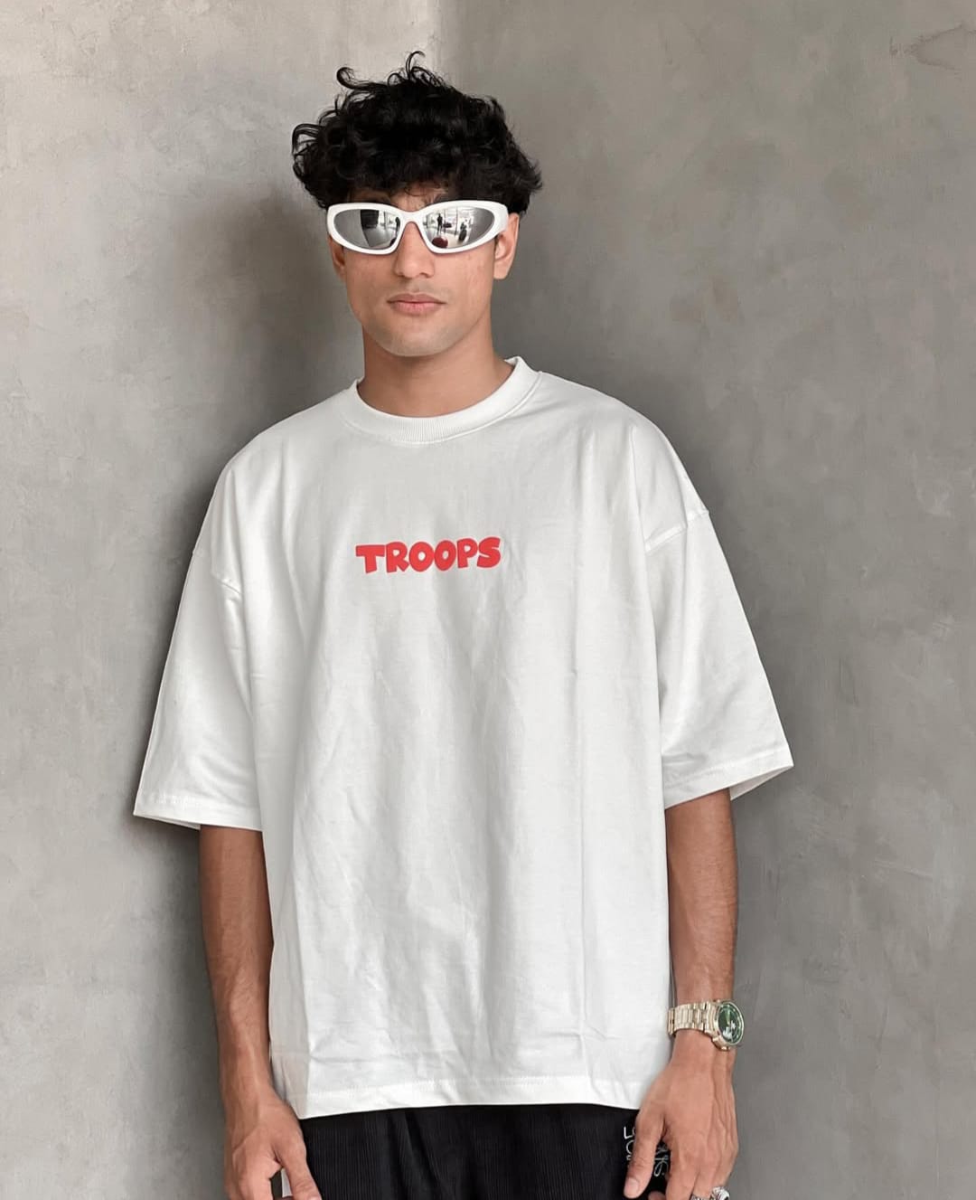 Make a bold statement with our "Divez Troops" Graphic Oversized Tee. This crisp white t-shirt features a striking red "TROOPS" logo on the front for a clean, impactful look. The back showcases a unique, eye-catching cartoon character graphic amidst a gradient "DIVEZ" text design, finished with "DIVEZ TROOPS" at the bottom. Crafted with an oversized, relaxed fit, this tee offers maximum comfort and a contemporary streetwear aesthetic. Made from soft, durable fabric, it's perfect for everyday wear, adding an edgy touch to your casual outfits. Pair it with joggers, cargo pants, or jeans for an effortlessly cool ensemble.